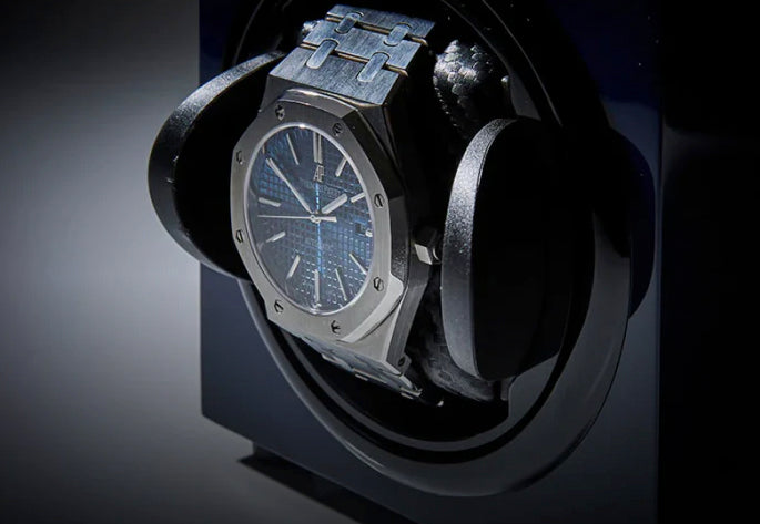 使用自动上链器非常简单直观:将腕表稳固地放置在垫子上,设置旋转方向(顺时针、逆时针或交替),然后选择合适的每日转数 (TPD)。上链器随后会间歇性地旋转腕表,以维持其动力储备和精准度。